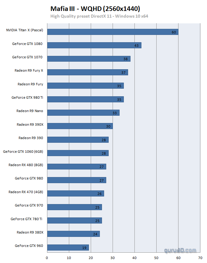 Оригинальный материал можно найти тут, я привожу из него лишь несколько графиков и кое-какие данные. Тесты ниже проводились на ПК с процессором Intel Core i7-5960X Extreme Edition @ 4.4ГГц на материнской плате с чипсетом X99, определённо не самая распространённая конфигурация. Управлялась система Windows 10, версия драйверов для GeForce - 373.06 WHQL, для Radeon - Radeon Software Crimson Edition 16.10.1. Использование столь мощного ПК объясняется просто - дабы процессорная составляющая не стала препятствием для раскрытия полного потенциала тестируемых видеокарт.