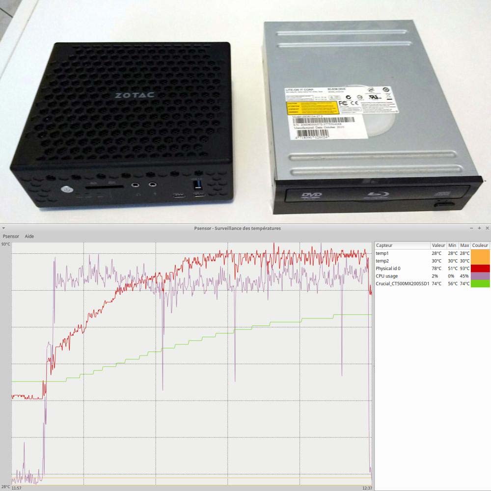 Итак, как сообщает ресурс FanlessTech, новое творение компании Zotac в лице пассивно охлаждаемого мини-ПК/баребона ZBOX CI523 Nano в реальном использовании очень сильно нагревается и начинает троттлить (производительность автоматически уменьшается для снижения температуры процессора). Следующие фото присланы неким Laloi, который увидев температуру в 93 градуса по Цельсию на процессоре детища Zotac при 45% нагрузке, принял решение вернуть аппарат назад: