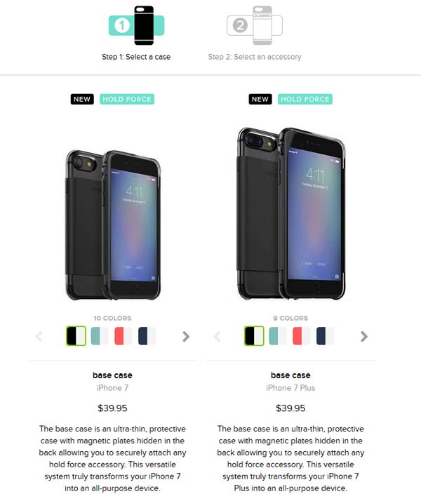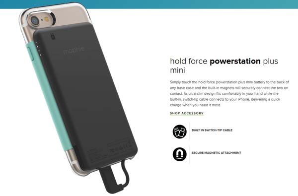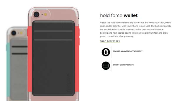 Mophie предложила целое семейство аксессуаров Hold Force, есть модели как для iPhone 7, так и для iPhone 7 Plus. Помимо чисто защитных функций данные чехлы (Hold Force Case) могут при помощи магнитных модулей наращивать свой функционал, например с помощью Hold Force Wallet у продукта Apple волшебным образом появится место для банковских карт и ID (аналог нашего паспорта, но гораздо компактнее), а Hold Force Folio даёт возможность держать три карты и прикрывать фронт умного телефона таким же образом как обложка книги закрывает страницы. Есть и агрегат Hold Force Powerstation Plus Mini, добавляющий батарею на 4000 мАч, что даёт "айФону" до 12 дополнительных часов работы.