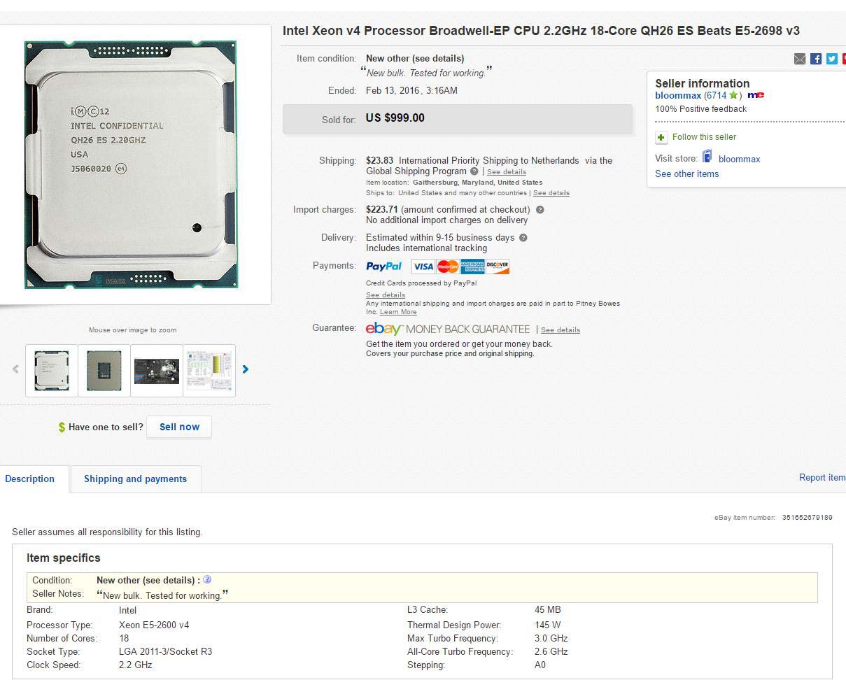 Несколько дней назад на Ebay появился годный для приобретения инженерный образец процессора Intel Xeon E5-2600 v4 (Broadwell-EP), продавец оценил его в практически в 1000 долларов США. Указанное решение создано по нормам 14нм тех.процесса, обладает TDP в 145 ватт, предназначено для работы с системными платами на базе чипсета X99.