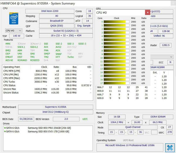 Тактовая частота в базовом режиме составляет 2.2ГГц, в Turbo - 3.0ГГц при частичной загруженности и 2.6ГГц при полной, учитывая наличие поддержки Hyper-Threading, "камушек" способен обрабатывать до 36 потоков информации одновременно. Процессор имеет 2.5МБ кеша третьего уровня, общий объём кеша равен 45 мегабайтам. Указано, что новинка совместима со следующими материнскими платами:
