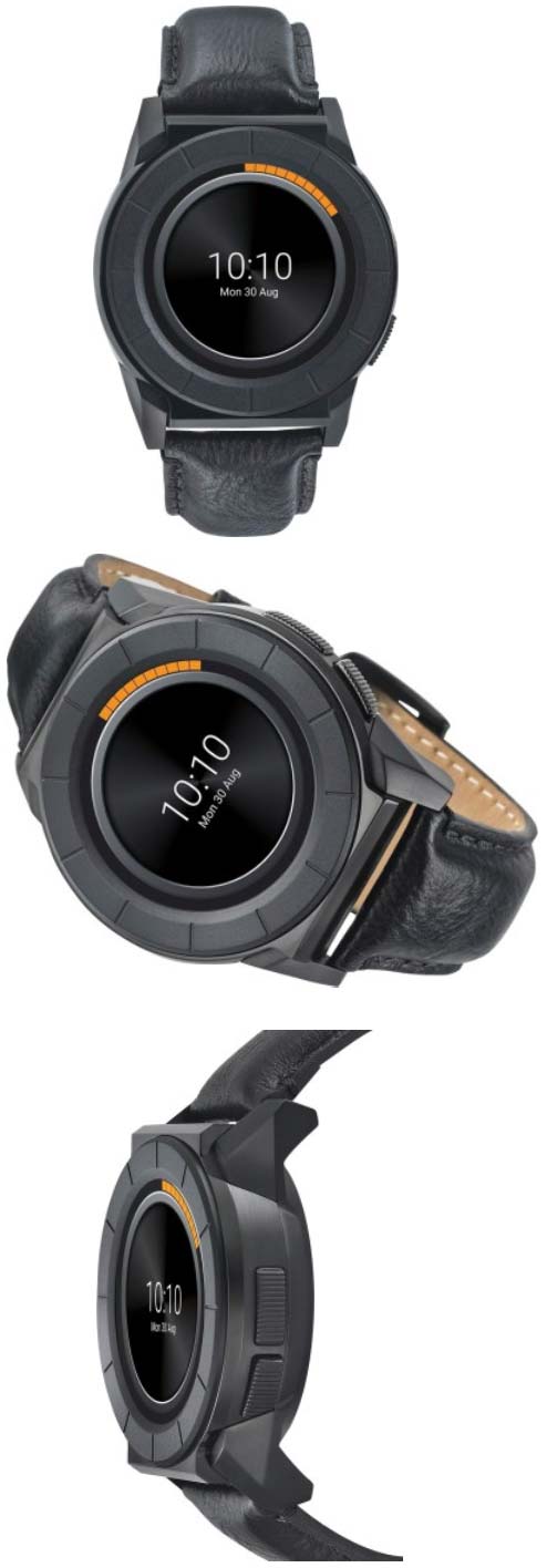 Ремешок часов сделан из кожи, корпус сделан из нержавеющей стали. Решение базируется на некой двухъядерной SoC, обладает 512МБ оперативной памяти и 4ГБ встроенной памяти. Размеры составляют 49.5x50.2x15.2мм, есть поддержка Bluetooth 4.0, связь держится с управляемыми Android и iOS умными телефонами.