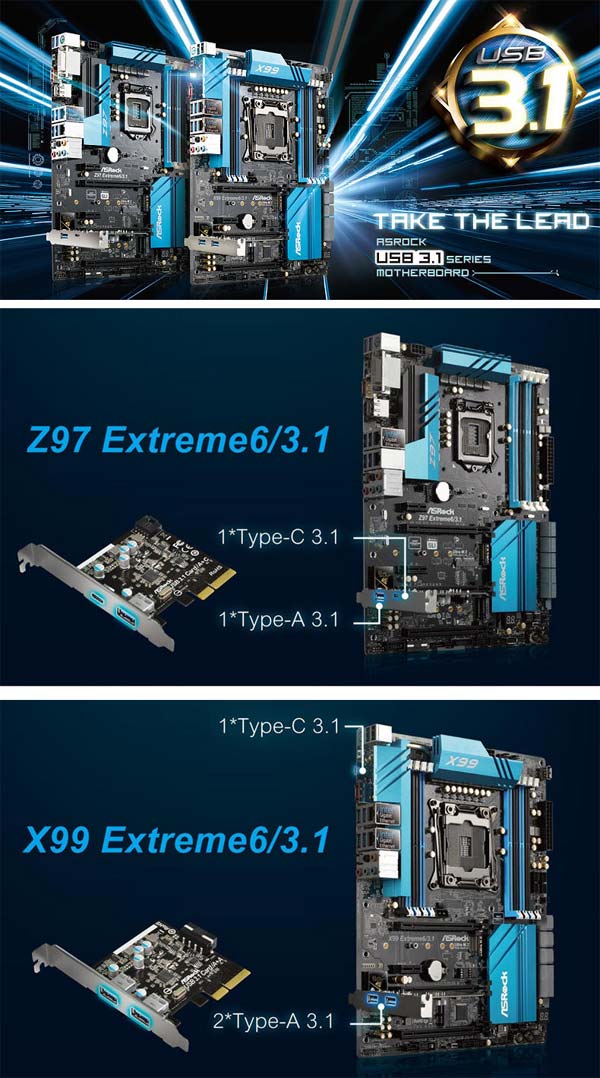 ASRock же мельком показала платы Z97 Extreme6/3.1 и X99 Extreme6/3.1, которые будут иметь порты USB 3.1. Производители явно преувеличивают значимость данной "фичи", всё равно на рынке практически отсутствуют накопители (и прочие устройства тоже) с этим интерфейсом передачи данных.
