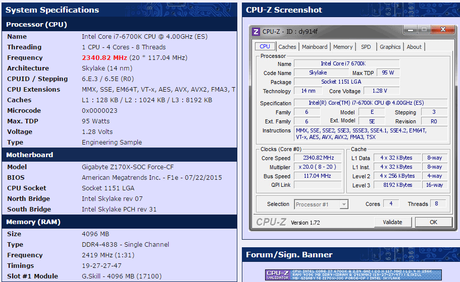 На плате Z170X-SOC Force был установлен процессор Core i7-6700K, работавший на пониженной частоте 2340МГц, но все его ядра были активны, а HT не деактивирован.