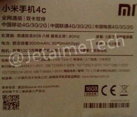Итак, данные о Xiaomi Mi 4c попали в Сеть с фото коробки этого смартфона. Аппарат может похвастаться 5" экраном с разрешением 1920x1080 и шестиядерной SoC Snapdragon 808 с графикой Adreno 418 в качестве основы. Устройство получило 2ГБ оперативной и 16ГБ встроенной расширяемой флеш памяти, в продаже также появится 32ГБ вариант агрегата.