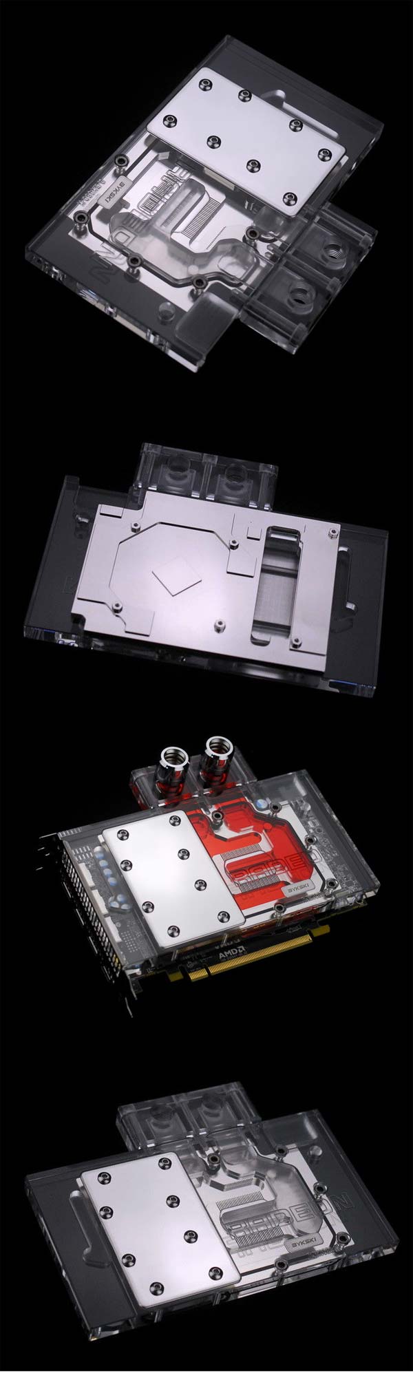 Перед нами типичный представитель класса Full-cover водоблоков - устройство охлаждает как GPU карты, так и память с VRM. Сделано оно из никелированной меди, защищено антиокислительным покрытием, в водоблоке используется прозрачный акрил, из него сделан крышка. Устройство не мешает объединить две видеокарты в CrossFire. Цена вопроса - 99 долларов США.