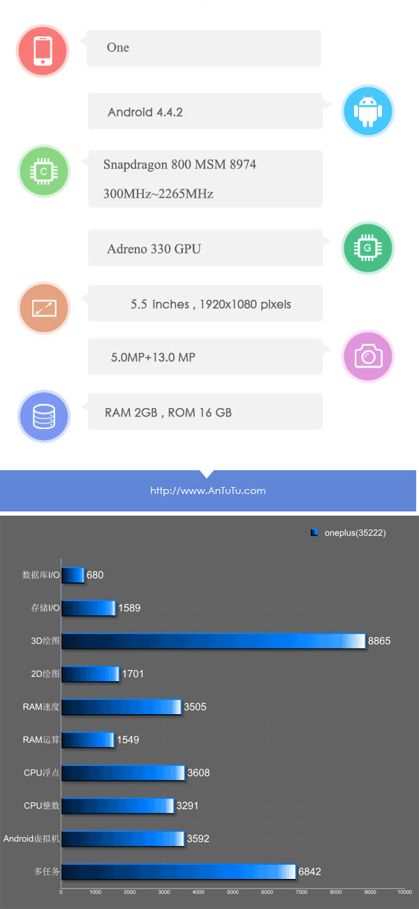 Ниже на скриншоте из базы данных AnTuTu Benchmark озвучены спецификации аппарата, с частью их мы уже знакомы: основой фаблета стала SoC Snapdragon 800 (300~2265МГц), объём оперативной памяти равен 2ГБ, места для файлов пользователя выделено 16ГБ. Управлять изделием доверено Android 4.4.2, экран у планшетофона 5.5" с разрешением 1920x1080. Фото и видео позволят снимать с помощью 13МП тыловой и 5МП фронтальной камер.