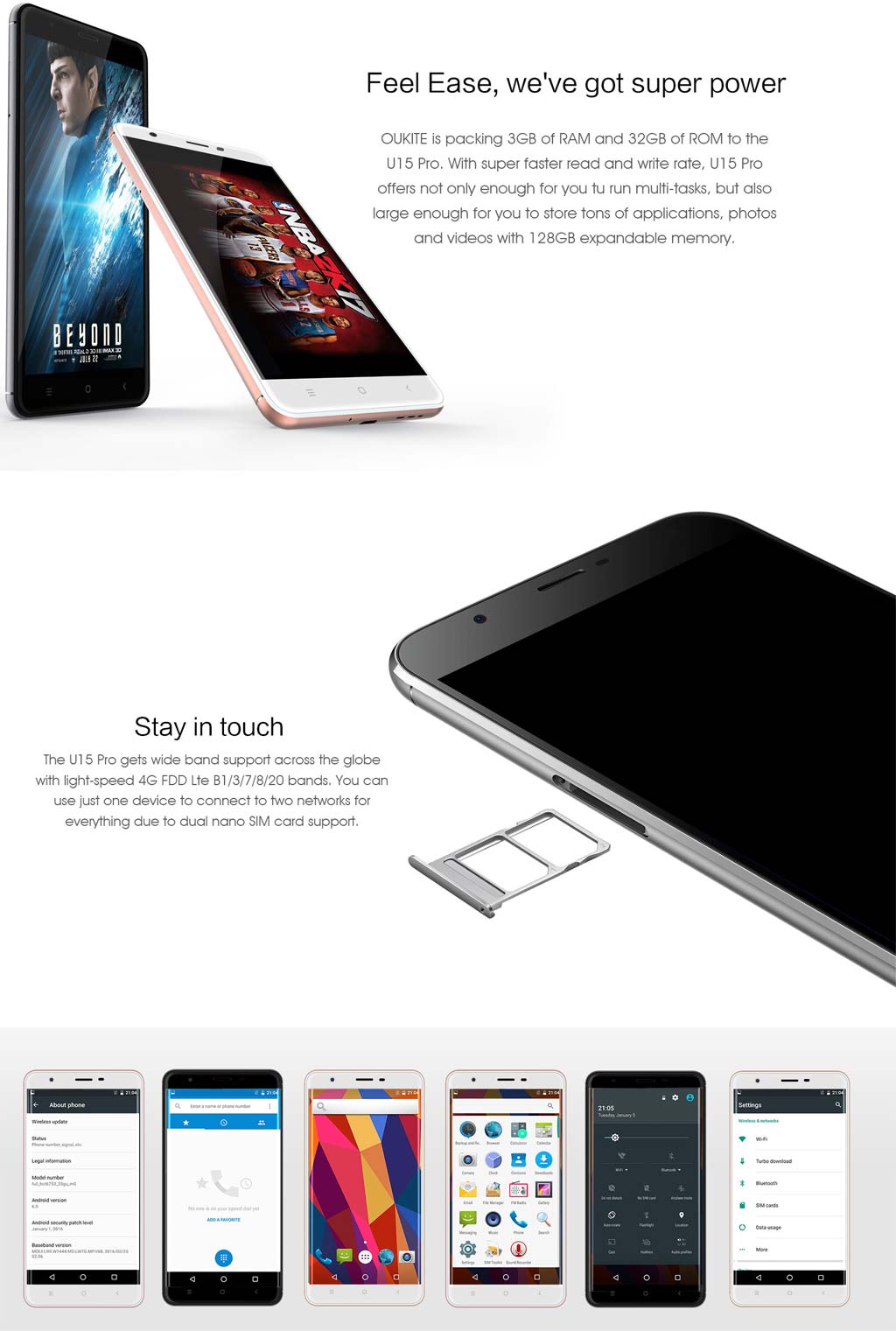 Размеры изделия: 153.2x78x8.7мм, вес равен 201.1 граммам, корпус сделан из сплава алюминия, доступные цвета: розовое золото, серый и золотистый. Аппарат оснащён надёжной SCUD батареей на 3000 мАч, имеет два слота для Micro SIM карт, работает в сетях 2G, 3G и 4G, поддерживает 802.11b/g/n WiFi, HotKnot и Bluetooth 4.0, имеет FM радио-тюнер, порт Micro USB/OTG, набор датчиков.