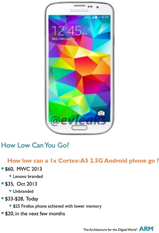 Компания ARM считает, что уже в этом году мы увидим смартфон с её детищем внутри, стоящий всего лишь 20 долларов США. На слайде выше показано положение дел за год с лишним с умными телефонами, построенными на базе одноядерной SoC с Cortex-A5, мол за 60 долларов США компания Lenovo предлагала свой продукт на MWC 2013, уже в октябре 2013 всякие ноунейм производители продавали устройства за $35, а уже сейчас за $28-33 можно купить управляемые Firefox OS смартфоны.