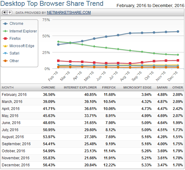 Следующие графики и таблички дают понять какие браузеры пользовались популярностью в прошлом году, с февраля до декабрь: