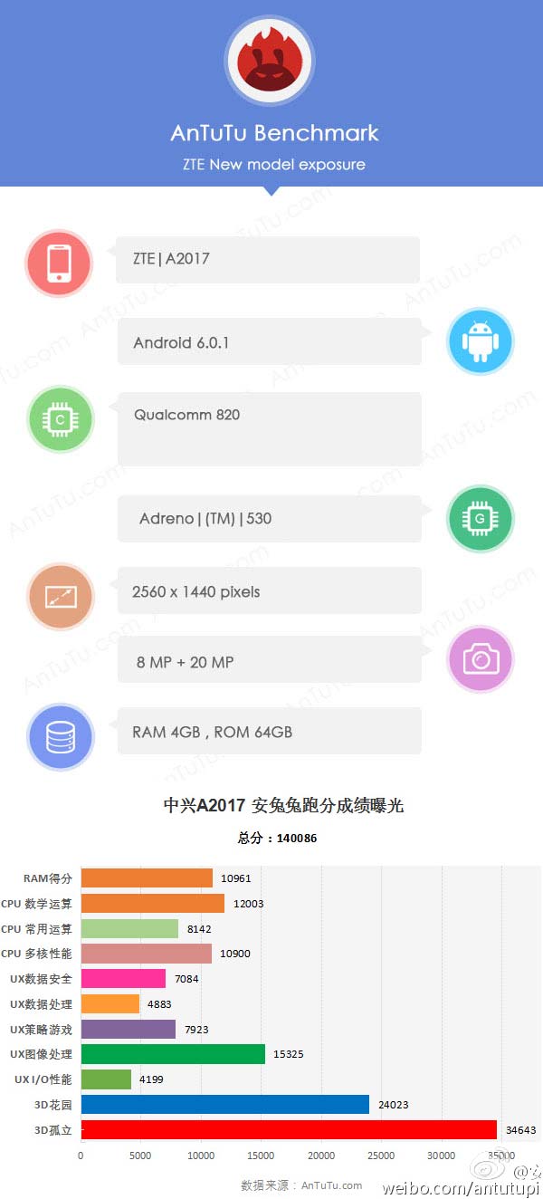 Следующие данные из AnTuTu Benchmark раскрывают нам характеристики некоего аппарата от ZTE, пока именуемого A2017: