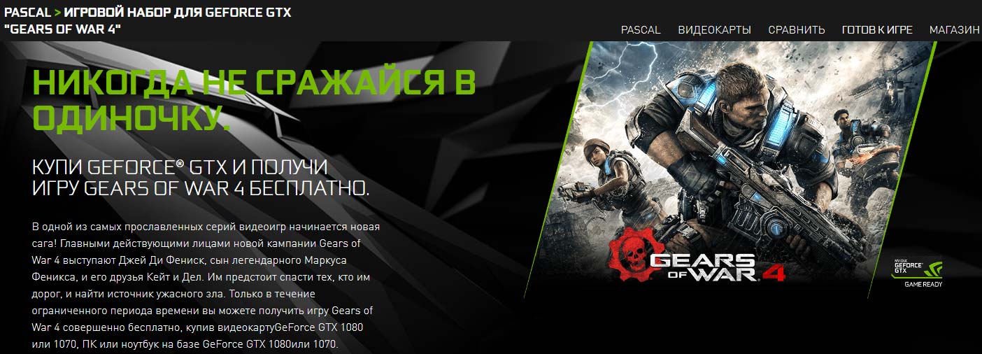 Уникальное, но ограниченное предложение от Nvidia! Все покупатели видеокарт GeForce GTX 1080 и 1070, как десктопных, так и мобильных версий, получат в подарок игру Gears of War 4, причём как ПК (Windows 10, будь он неладен!), так и Xbox One вариант. Нам объясняют, что для игры в 4K (3820x2160) понадобится GeForce GTX 1080, для WQHD (2560x1440) сгодится GTX 1060, ну а для Full HD (1920x1080) подойдёт... что бы Вы думали? GeForce GTX 750 Ti! Весьма странное заявление, что уж тут говорить, уважаемые читатели...