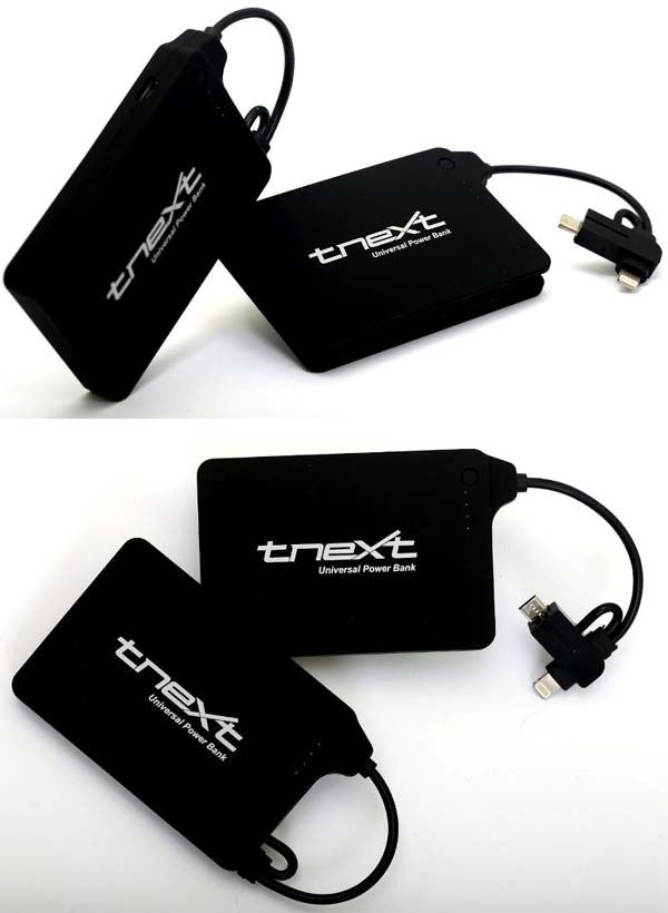 tnext E4000s представляет собой портативное зарядное устройство (так называемый "пауэрбэнк"), в изделии используется литий-полимерная батарея на 4000 мАч. Устройство интересно тем, что совместимо как с управляемыми Android смартфонами, так и с продуктами Apple. Коннекторов два - Micro USB и Lightning, по ним выдаётся 5V/2.1A. Размеры решения составляют 83x59x12.5мм, вес равен 95 граммам.