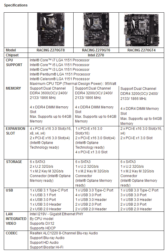 Нашему вниманию предлагается следующая табличка, которая содержит, пусть и на английском языке, все необходимые для усвоения характеристики материнских плат Biostar серии RACING на базе чипсета Z270 от Intel: