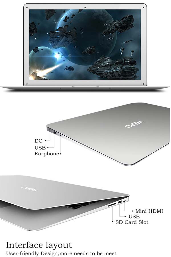 YEPO 737S не имеет оптического привода, зато обладает SD картридером, видеовыходом mini-HDMI, двумя USB 2.0, 3.5мм аудиовыходом, 0.3МП веб-камерой. Экран изделия IPS типа, его диагональ составляет 13.3", разрешение - 1920x1080, есть поддержка Bluetooth и WiFi, питание осуществляется от батареи на 8000 мАч. Размеры новинки: 335x225x18мм, вес равен 1250 граммам.