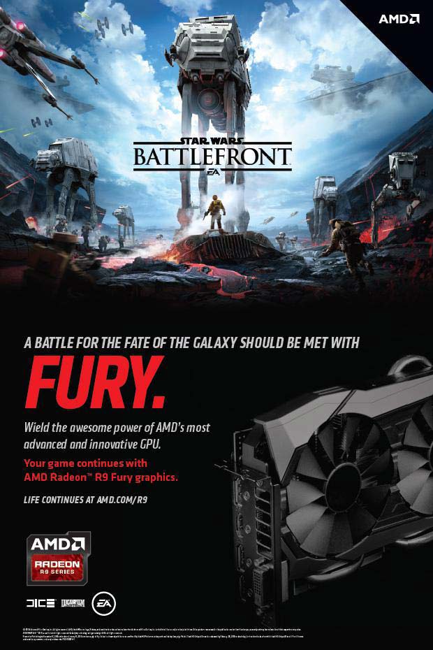 Хорошие новости для тех, кто собирается прикупить видеокарту Radeon R9 Fury. Начиная с 17 ноября, все новые обладатели этого графического решения AMD получат право бесплатно заполучить в свою коллекцию вышедшую только вчера игру Star Wars Battlefront. Предложение действует до 31 января 2016 года, купоны на игру можно поменять до 29 февраля 2016 года включительно.