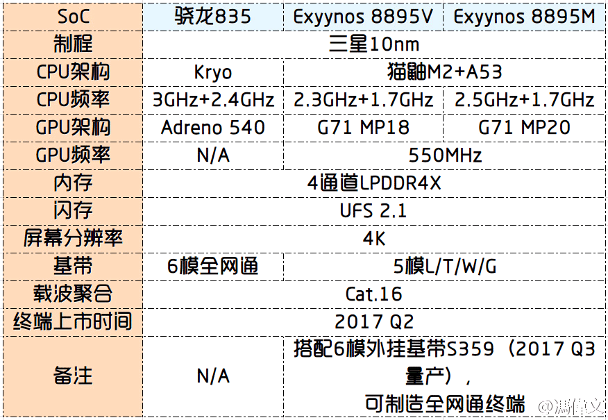 Как и Snapdragon 835, новинка от Samsung производится по 10нм тех.процессу, однако будет доступна в двух вариантах: Exynos 8895M и 8895V, один от другого будет отличаться тактовой частотой ядер и GPU. 8895M будет функционировать на 2.5ГГц и иметь графику G71 MP20, в то время как 8895V получит тактовую частоту в 2.3ГГц и графику G71 MP18.