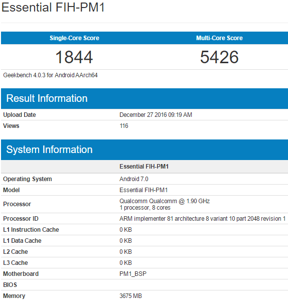 На сайте бенчмарка Geekbench засветился некий аппарат Essential FIH-PM1, оснащённый 4ГБ оперативной памяти и управляемый Android 7, основой изделия значится некая SoC с кодом-идентификатором ARM 81, по мнению моих иностранных коллег это Snapdragon 835, будущая основа смартфонов/фаблетов самого высокого уровня недалёкого будущего. Новинке удалось набрать 1844 очка в одноядерном тесте и 5426 очков во многоядерном.