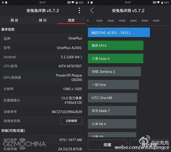 Аппарат набрал 54311 очков, что весьма круто. Как видно, решение получило 5" Full HD экран, основой девайса стала MediaTek MT6795T с графикой PowerVR Rogue G6200, объём оперативной памяти равен двум гигабайтам, ёмкость накопителя равна 32 гигабайтам, управление смартфоном взяла на себя Android 5.1.1, а тыловая камера получила 13МП сенсор. Ждём анонса агрегата от OnePlus, уважаемые читатели.