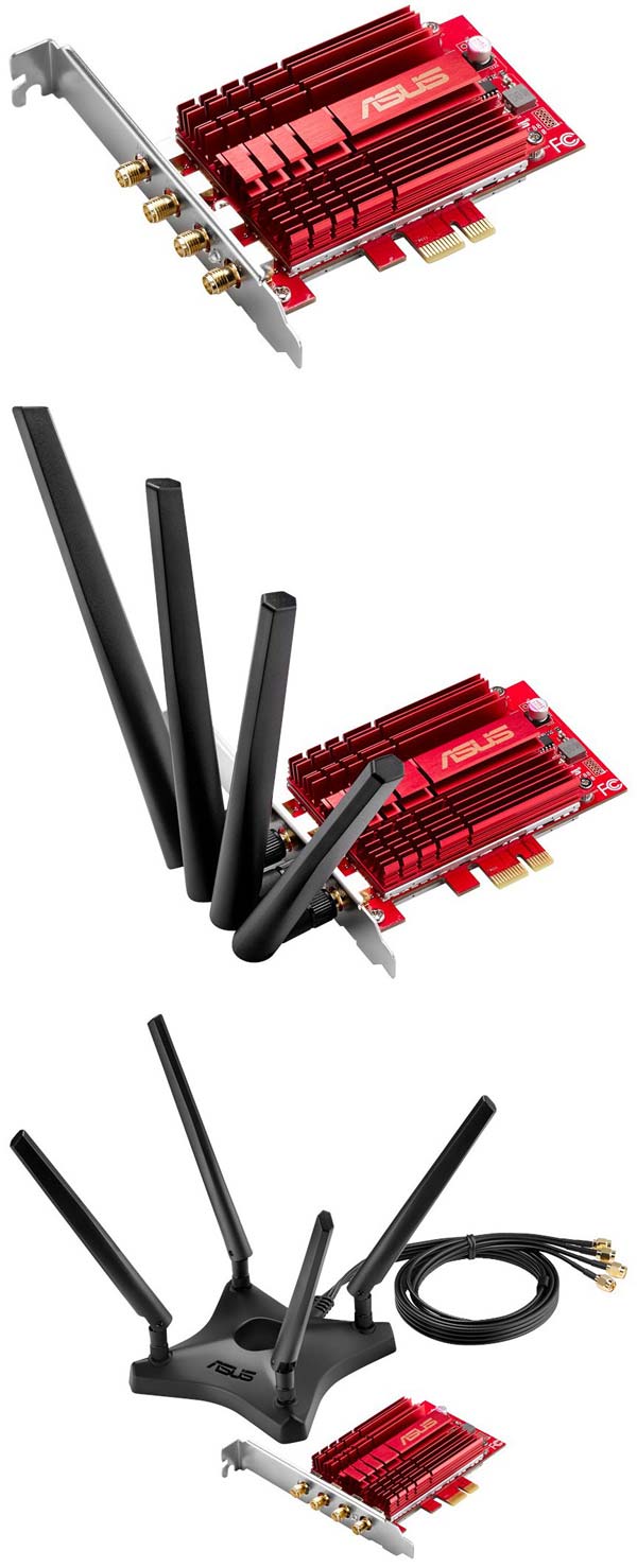 ASUS же хочет распространить WiFi среди обычных ПК, причём самый быстрый. Устройство называется PCE-AC88, представляет собой набор из подключаемой в слот PCI Express 2.0 x1 сетевой карты, а также соединённого с ним модуля с антеннами, смахивающий на современный роутер. Более того - решение и обладает функционалом роутера, скорость передачи данных этого Dual Band 4x4 AC3100 устройства составляет до 2.1Гб/с на частоте 5ГГц и до 1Гб/с на 2.4ГГц. Такие чудеса стали возможны, благодаря применению технологии NitroQAM (1024-QAM).