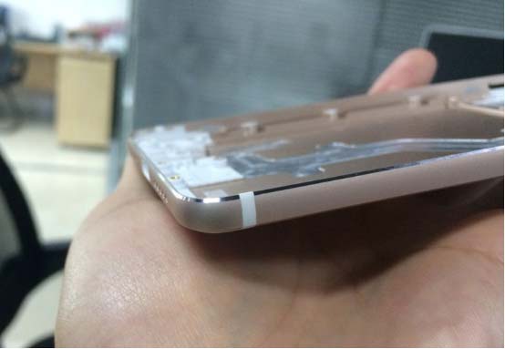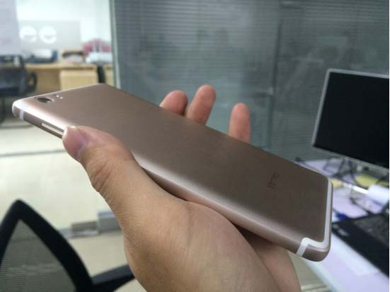 Нам демонстрируют аппарат золотистого цвета, внимание акцентируется на тыловой части решения, в очередной раз речь идёт о схожем с используемым Apple размещением антенны. Изделие весьма тонкое, а значит им можно будет легко оперировать с помощью одной руки.