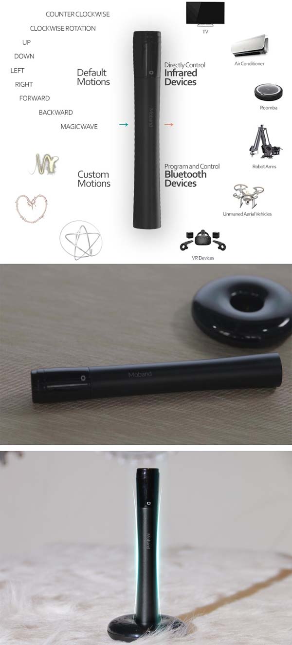 Moband мог бы считаться обычным универсальным пультом управления, если бы не одно "но" - устройство не имеет кнопок, настраивается через смартфон, а управляет домашней техникой посредством жестов. Аппарат нужно использовать как своего рода волшебную палочку, накручивая с его помощью различные фигуры в воздухе, нужно это для разных целей: чтобы включить телевизор, активировать робот-пылесос, освежить помещение с помощью кондиционера и так далее.