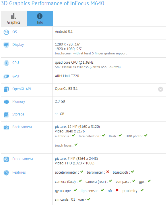 Аппарат InFocus M640, как можно убедиться, получит два экрана - 5.5" основной с разрешением 1080p, а также 3.6" с разрешением 720p. Станет ли агрегат противником YotaPhone и его клонов - пока неясно, т.к. предназначение второго экрана неизвестно. Основой нового умного устройства стала 1.3ГГц 4-ядерная SoC MediaTek MT6735, также используются 3ГБ оперативной памяти, 16ГБ встроенной расширяемой (скорее всего) флеш памяти и графическое решение Mali-T720. Тыловая камера обладает 13МП сенсором и LED вспышкой, фронтальная - 8МП сенсором.