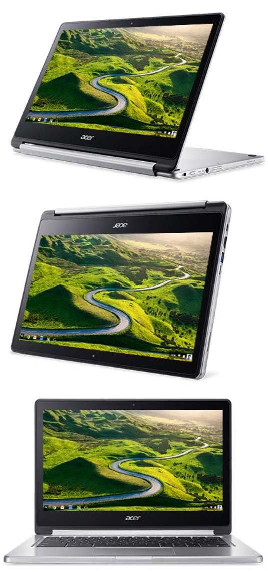 Итак, аппарат Acer Chromebook R13 CB5 обладает 13.3" IPS сенсорным экраном с LED подсветкой, разрешение которого составляет 1920x1080, дисплей поворачивается как показано на фото чуть ниже, всего для творения Acer доступно четыре режима работы. Основой решения стала SoC MediaTek MT8173 с графикой PowerVR GX6250.