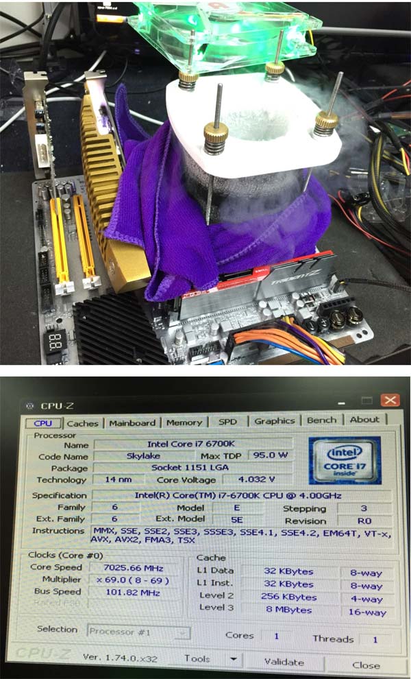 Некоторое время назад был поставлен рекорд по разгону процессора Core i7-6700K, который до сих пор не побит. Автор достижения - представитель Гонконга Chi-Kui Lam, ему удалось поднять тактовую частоту этого приятного творения Intel до 7025.66МГц, конечно же не обошлось без жидкого азота и снятия крышки распределения тепла: