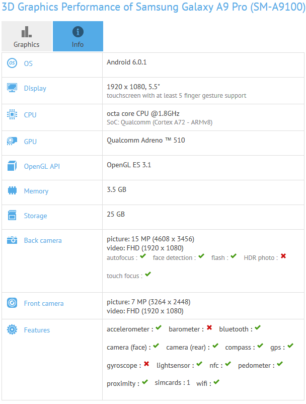 Сведения о фаблете Galaxy A9 Pro (SM-A9100) появились из базы данных бенчмарка GFXBench, говорится что у аппарата будет 5.5" Full HD экран, хотя многие люди "в теме" считали, что меньше дисплей с диагональю меньше 6 дюймов решение никак иметь не может. Основой новинки стал чип Snapdragon 652 с графикой Adreno 510, объём оперативной памяти равен 4ГБ, тыловая камера имеет 16МП сенсор (возможно, Sony IMX298), фронтальная - 8МП. Управление решением доверено Android 6.0.1, флеш памяти в распоряжении владельца 25 из 32 гигабайт.