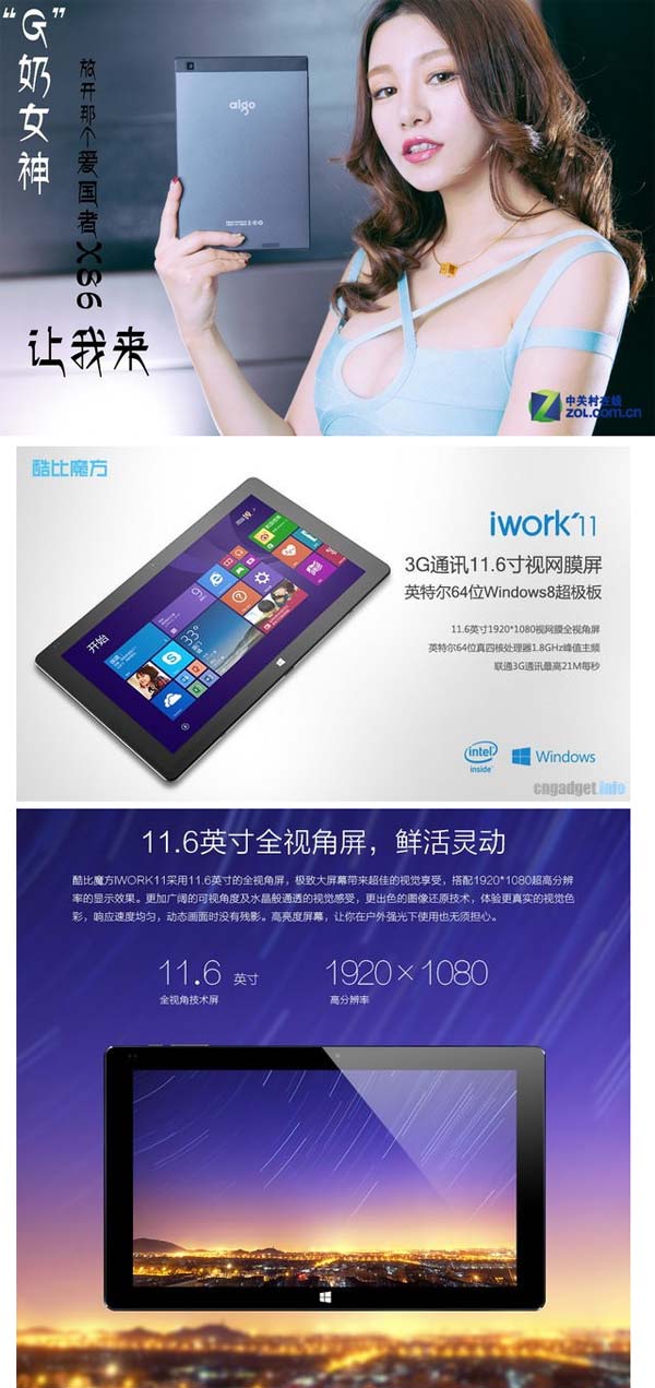 Что касается планшета Cube iWork 11, то у него 11.6" экран с Full HD разрешением, также SoC от Intel, возможно популярная Atom Z3735. Объём оперативной памяти равен 2ГБ, места для файлов владельца на накопителе eMMC типа выделено 64ГБ, управляется девайс Windows 8.1. Устройство также обладает видеовыходом HDMI, поддержкой сотовой связи GSM/WCDMA, а также Bluetooth и WiFi.