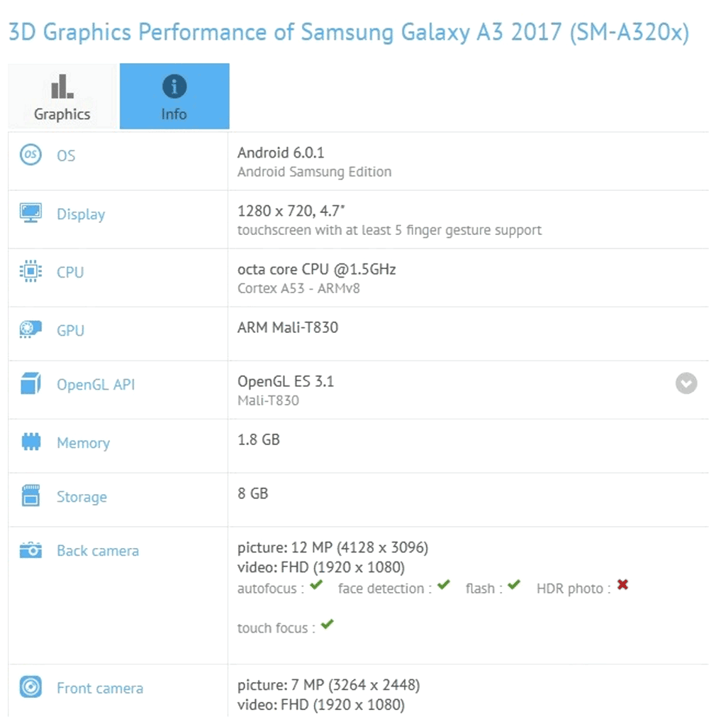 Как видно, у аппарата некая 8-ядерная 1.5ГГц SoC с графикой ARM Mali-T830, 2ГБ оперативной памяти, 8ГБ флеш памяти и 4.7" экран с разрешением 720p. Тыловая камера получила 12МП сенсор, а фронтальная - 8МП сенсор. Занятно, что по ряду параметров новый A3 уступает предшественнику, впрочем это может быть объяснено тем, что новый A3 будет доступен в продаже в нескольких конфигурациях. Управляется изделие Android 6.0.1 с пользовательским интерфейсом TouchWiz, на этом информация об аппарате заканчивается.