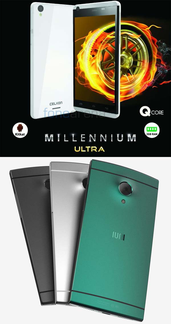 На верхнем фото (смотрите ниже) изображён аппарат Millennium Ultra Q500 от компании Celkon, он скоро будет представлен и нам назовут его полные спецификации, ну а пока этого не произошло, мы посмотрим имеющиеся данные. Изделие имеет в основе некую 4-ядерную SoC, обладает 5" IPS OGS экраном с разрешением 720p, наделено 2ГБ оперативной памяти и 16ГБ флеш памяти, которую разрешается расширить. Управляется изделие Android 4.4, стоить будет 9999 рупий (~5926 рублей). Ждём представления аппарата 14 августа и его релиза 24 августа.