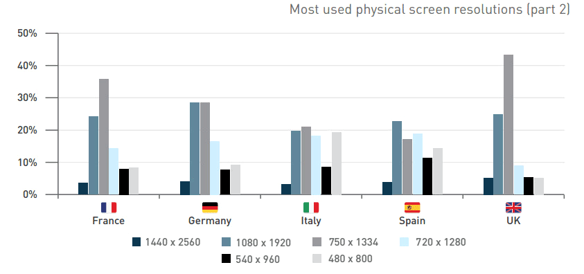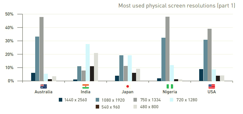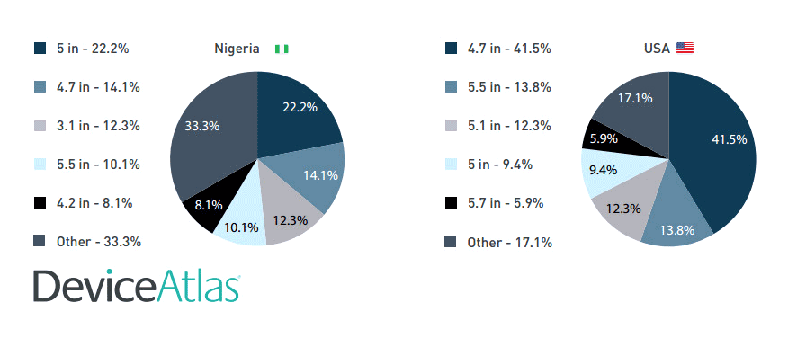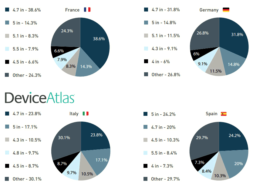 А вот несколько предоставленных DeviceAtlas графиков и диаграмм, которые ясно показывают наиболее популярные диагонали экранов умных устройств и их разрешения: