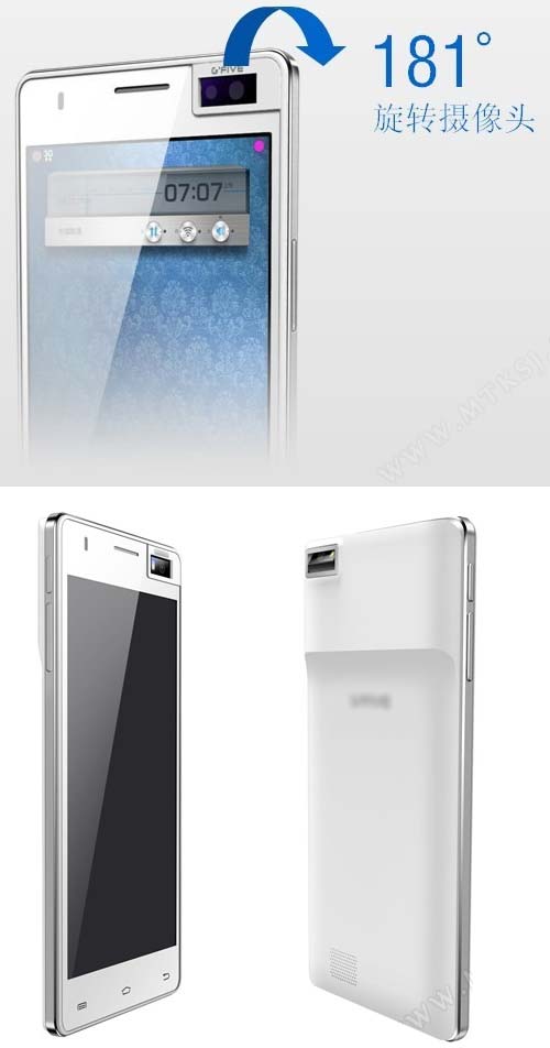 Фаблет Kivu A7 от Gfive решил пойти по пути, проложенному Oppo N1 и Gionee Elife E7, речь о наличии у аппарата поворачивающейся на 181° камеры. Кроме этой особенности перед нами вполне обычный агрегат с 5.5" экраном (разрешение которого не уточняется), 2ГБ оперативной памяти и 16ГБ флеш памяти. Основой аппарата стала четырёхъядерная 1.3ГГц SoC MT6582.