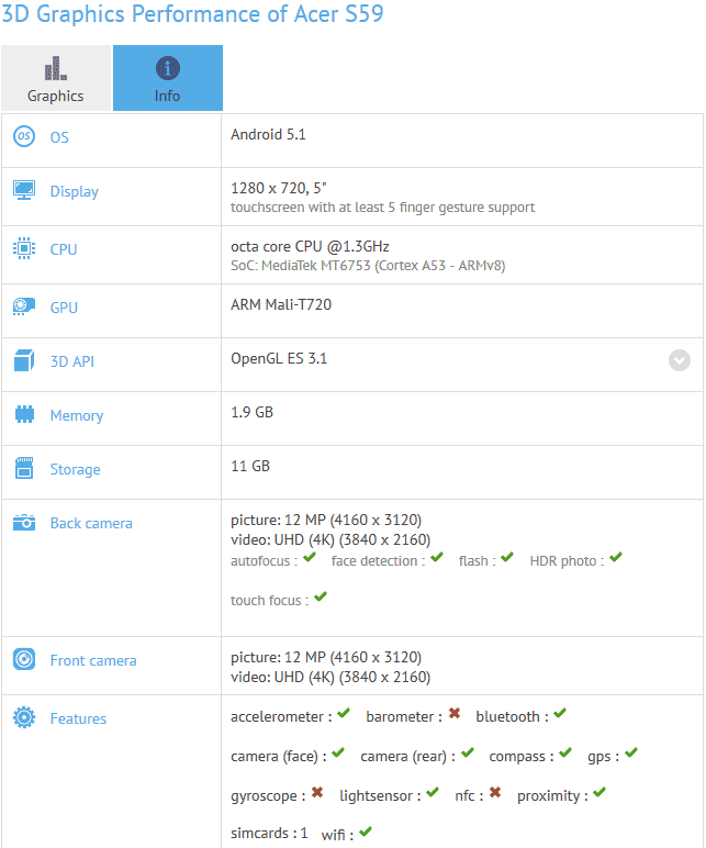 Изделие получило 5" экран с разрешением 720p, основой аппарата стала SoC MediaTek MT6753, оперативной памяти в наличии 2ГБ, флеш памяти - 16ГБ, тыловая камера получила 12МП сенсор, управление изделием легло на плечи Android 5.1. Ждём официальных сведений о новинке от Acer.