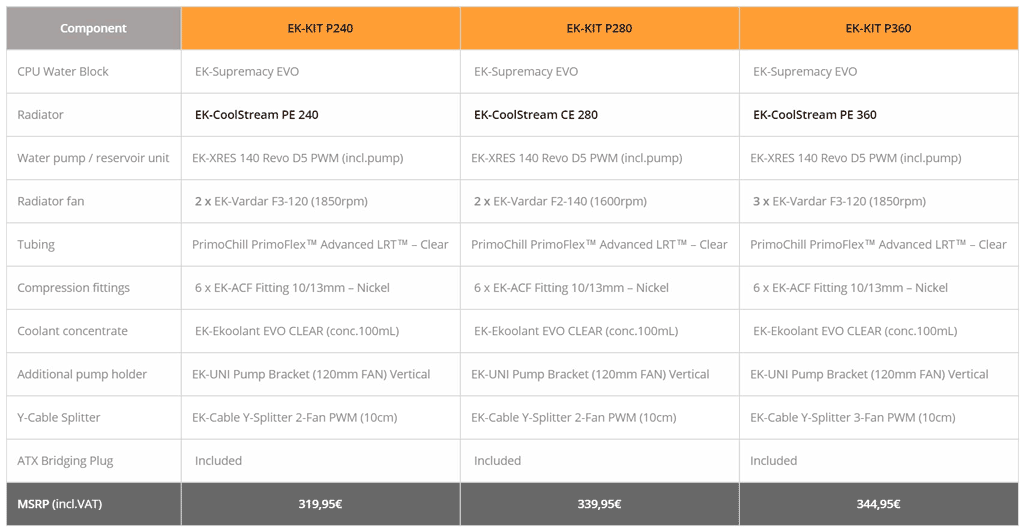 А вот трио новых комплектов готовых для сборки компонентов СВО серии Performance: EK-KIT P240, EK-KIT P280 и EK-KIT P360: