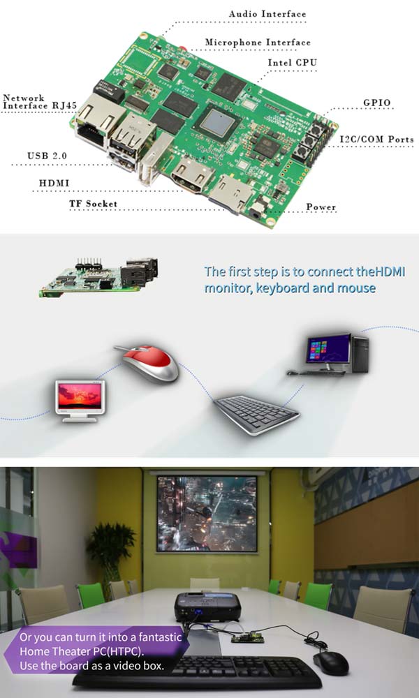Решение названо JaguarBoard, оно имеет размеры 101.9x64.5x1.6мм, использует процессор Inte Atom Z3735G, 1ГБ оперативной памяти DDR3L и 16ГБ eMMC флеш памяти. Решением может управлять Windows, Android или Linux, что порадует широкие народные массы с разными пристрастиями к ОС.