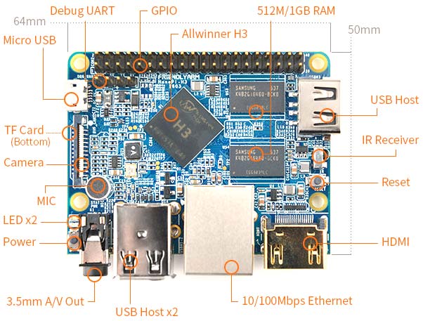 Плата называется NanoPi-M1, базируется на 4-ядерной SoC Allwinner H3 (Cortex A7 @ 1.2ГГц) с графикой ARM Mali-400MP2 (600МГц), имеет от 512МБ до 1ГБ оперативной памяти, слот для карты microSD/HC, последней придётся выступать в качестве накопителя. В наличии видеовыход HDMI, 100Мб/с Ethernet порт, 3.5мм аудиопорт для CVBS, три USB 2.0, один Micro USB/OTG, DVP интерфейс для камеры, 4-пиновый хедер Raspberry Pi, ИК ресивер, микрофон и многое другое. Решение имеет размеры 64x50мм, питается от Micro USB или через 5V/2A. В качестве ОС можно использовать Ubuntu Mate, Ubuntu Core или же Debian.