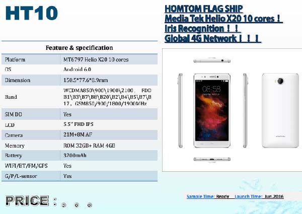 Итак, HT10 от HomTom получит 10-ядерную SoC MediaTek Helio X20 в качестве основы, будет обладать 4ГБ оперативной памяти и 32ГБ расширяемой флеш памяти. Управляется питаемый от аккумуляторной батареи на 3200 мАч девайс Android 6.0, имеет размеры 150.5x77.6x9мм, работает в сетях GSM, WCDMA и FDD-LTE. Экран аппарата IPS типа, диагональ - 5.5", разрешение - Full HD. Тыловая камера получила 21МП сенсор, фронтальная - 8МП, есть автофокус. Не обошлось без поддержки WiFi, GPS, Bluetooth, есть P/G/L-сенсоры и FM радио тюнер.
