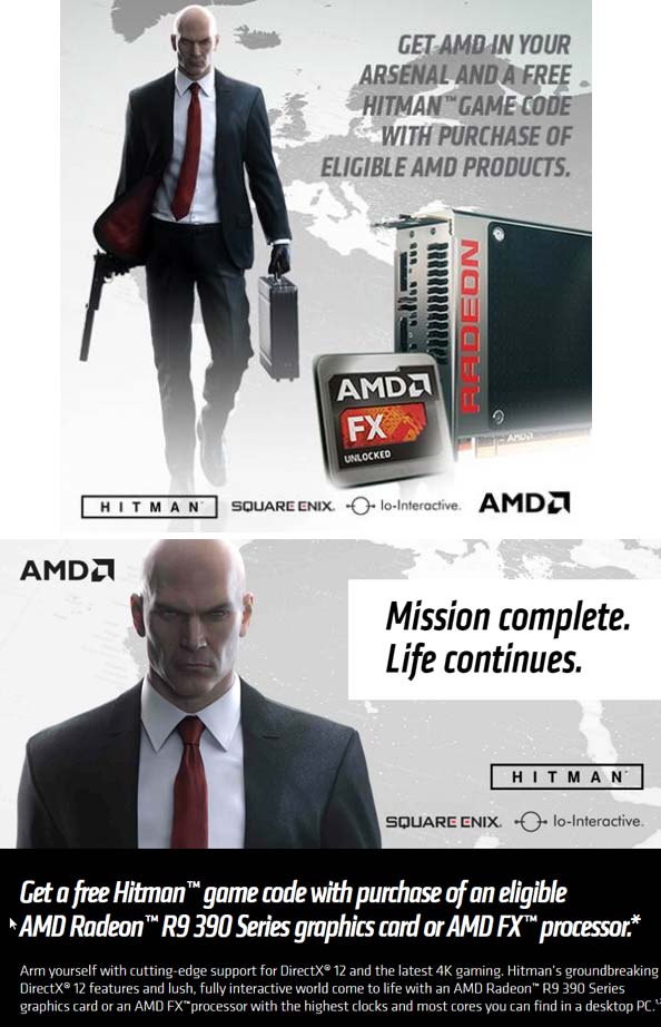 Хорошие вести для всех, кто хотел бы примерить на себя шкуру лысого наёмного убийцы из игры Hitman. AMD объявила, что приобретая видеокарты Radeon R9 390/R9 390X или процессоры AMD FX 6000 - 8000, покупатели получают копию игры, выход которой намечен на 11 марта. Сама акция распространяется только на избранные магазины, плюс длится лишь до 30 апреля. Игра будет поддерживать DirectX 12, хотя я бы был рад услышать о реализации API Vulkan.