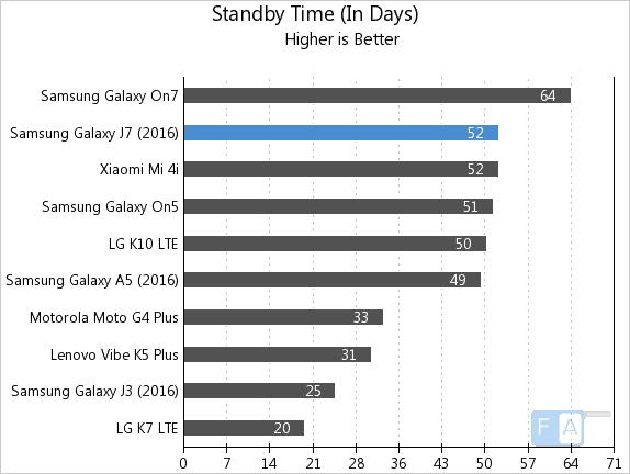Оригинальный материал о времени автономной работы агрегата Samsung Galaxy J7 (2016) можно найти вот тут, я предлагаю из него всего несколько графиков: