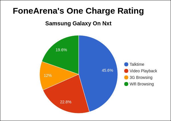 Итог выступления Galaxy On Nxt - 9 часов 1 минута, результат не ахти на фоне других творений Samsung, обладающих аккумуляторной батареей той же ёмкости (3300 мАч).
