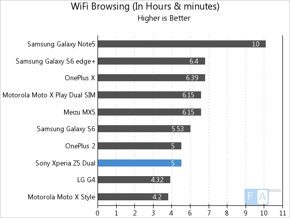 Итоговый результат Sony Xperia Z5 Dual - 10 часов 38 минут, что лучше результата LG G4 (9 часов 36 минут), но хуже Samsung Galaxy S6 (11 часов минут) и Galaxy S6 edge+ (12 часов 45 минут). В общем и целом, у продукта Sony всё довольно хорошо с автономностью.