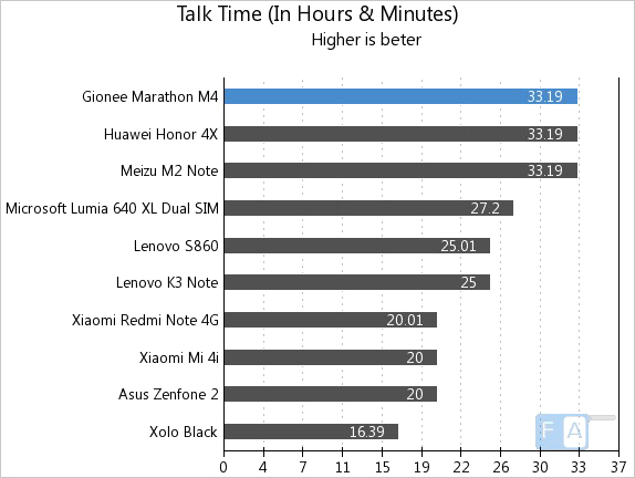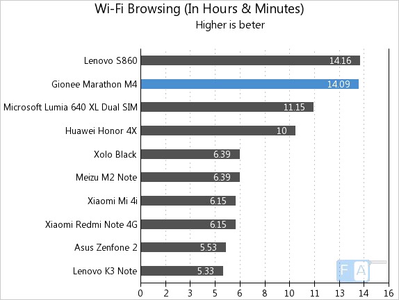 На данный момент времени Gionee Marathon M4 входит в число лучших среди протестированных Fone Arena на время автономной работы в различных режимах устройств. Учитывая ёмкость батареи смартфона в 5000 мАч, это не сильно удивляет