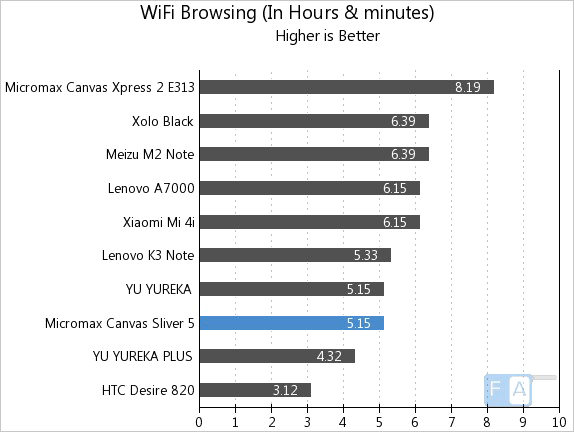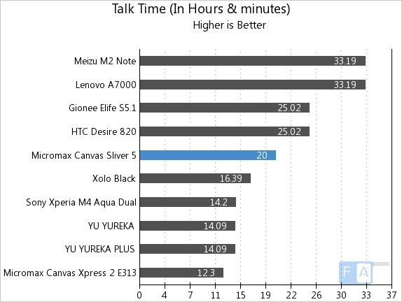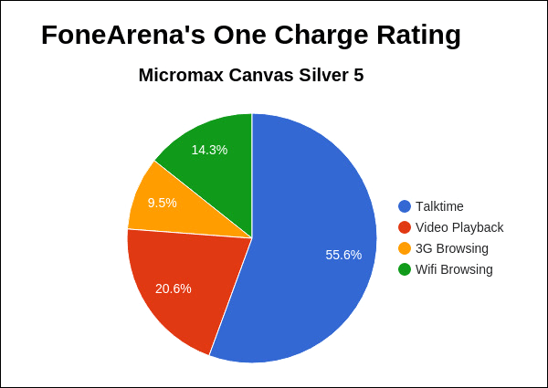Согласно результатам тестов, аппарат Micromax Canvas Silver 5 обладает впечатляющим временем автономной работы в режиме разговора, но вот в остальных тестах он показал себя в лучшем случае средне.