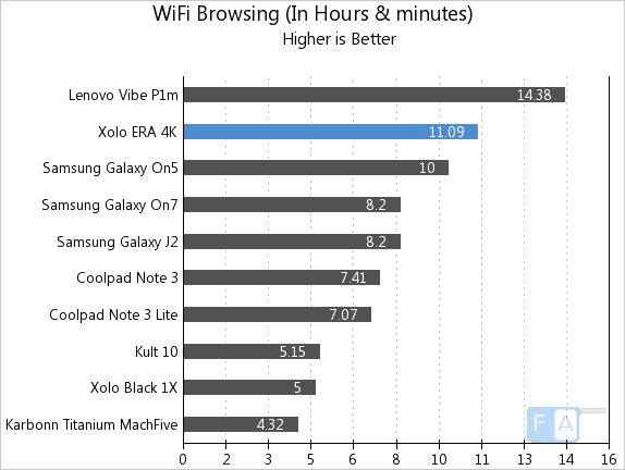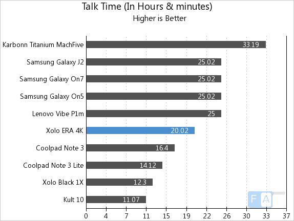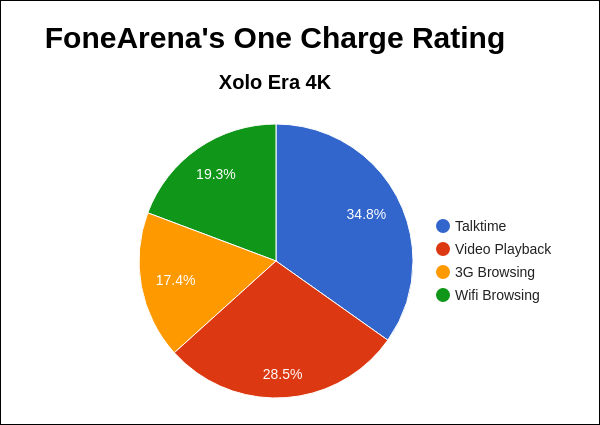 Итог тестов Xolo Era 4K - 14 часов 37 минут, результат весьма достойный, но обладающий батареей на 4000 мАч (ёмкость идентична аккумулятору Era 4K) Lenovo Vibe P1m смог продержаться 15 часов 38 минут.