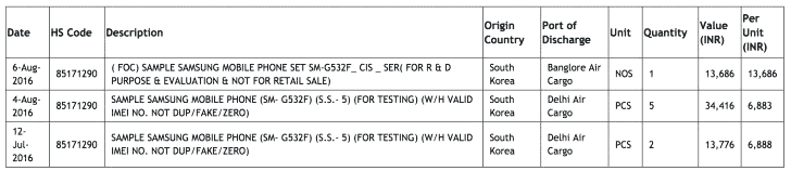 А вот сведения с Zauba о Samsung Galaxy Grand Prime (2016):