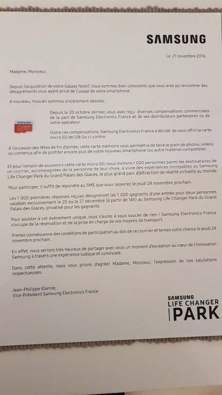 Вице-президент Samsung Electronics France предложил (в виде письма, его фото можно увидеть ниже) всем покупателям злополучного Galaxy Note7 получить 128ГБ карточку microSDXC в качестве компенсации за сложности с аппаратом, который, как известно, отозвали и прекратили производить. У получивших карточку памяти людей есть ещё и шанс выиграть путешествие (на двух человек) в Samsung’s Life Changer Park, где гостей будут удивлять различными VR аттракционами. Если кто захочет поменять свой Galaxy Note7 на Galaxy S7 или S7 edge, то им уступают 100 евро стоимости решения.