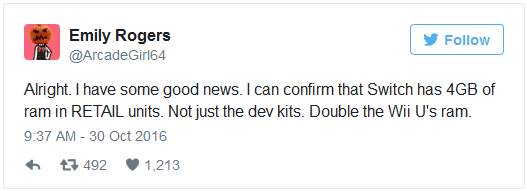 Следующий твит говорит о том, что игровая консоль получит 4ГБ оперативной памяти, что вдвое меньше чем у продуктов Sony и Microsoft: